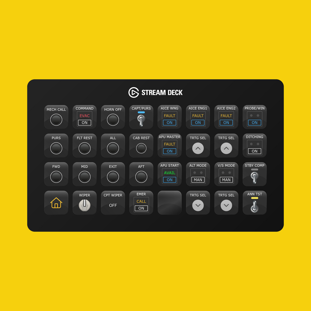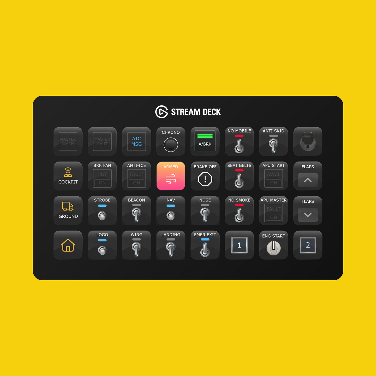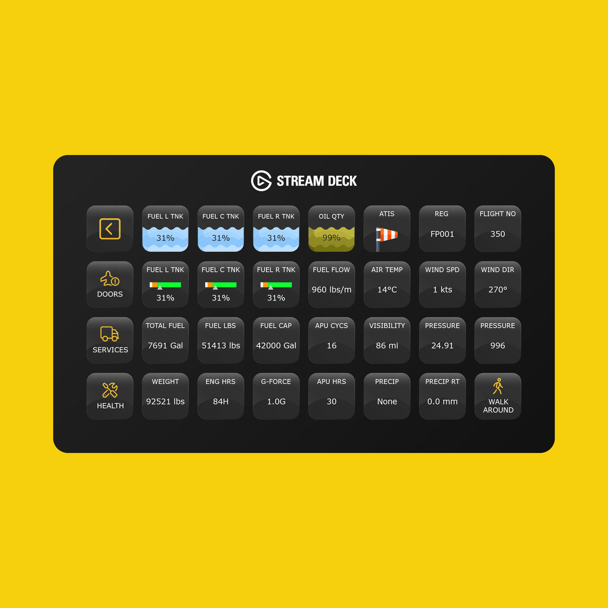 This profile is compatible with Microsoft Flight Simulator 2020 and Flight Simulator 2024. The following Elgato Stream Deck devices (not included) are supported: Stream Deck XL, Stream Deck Mobile, and Stream Deck MK.2.