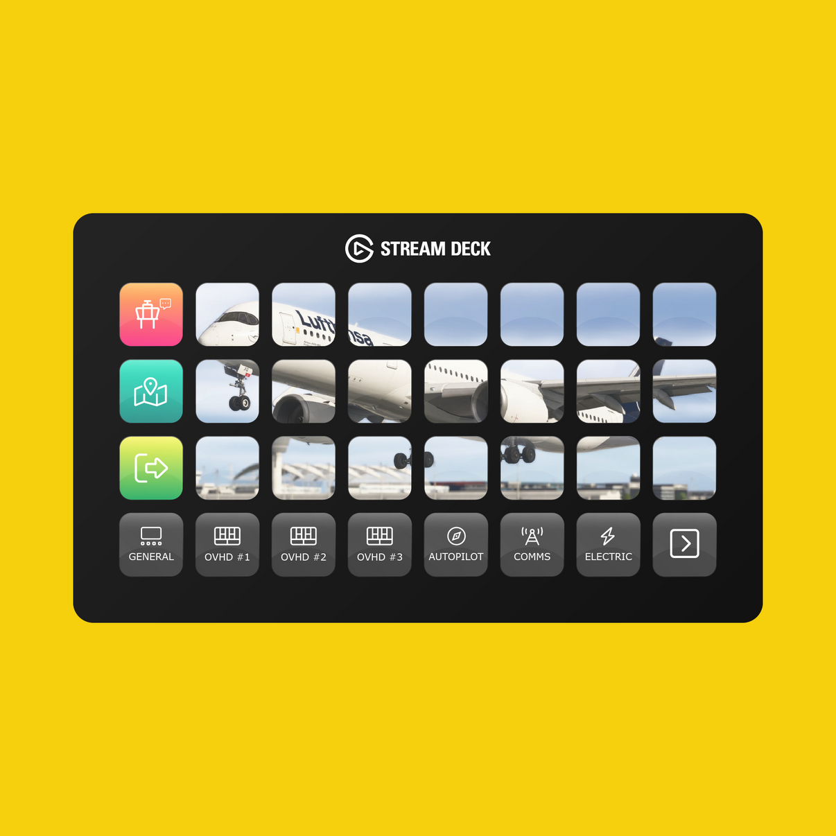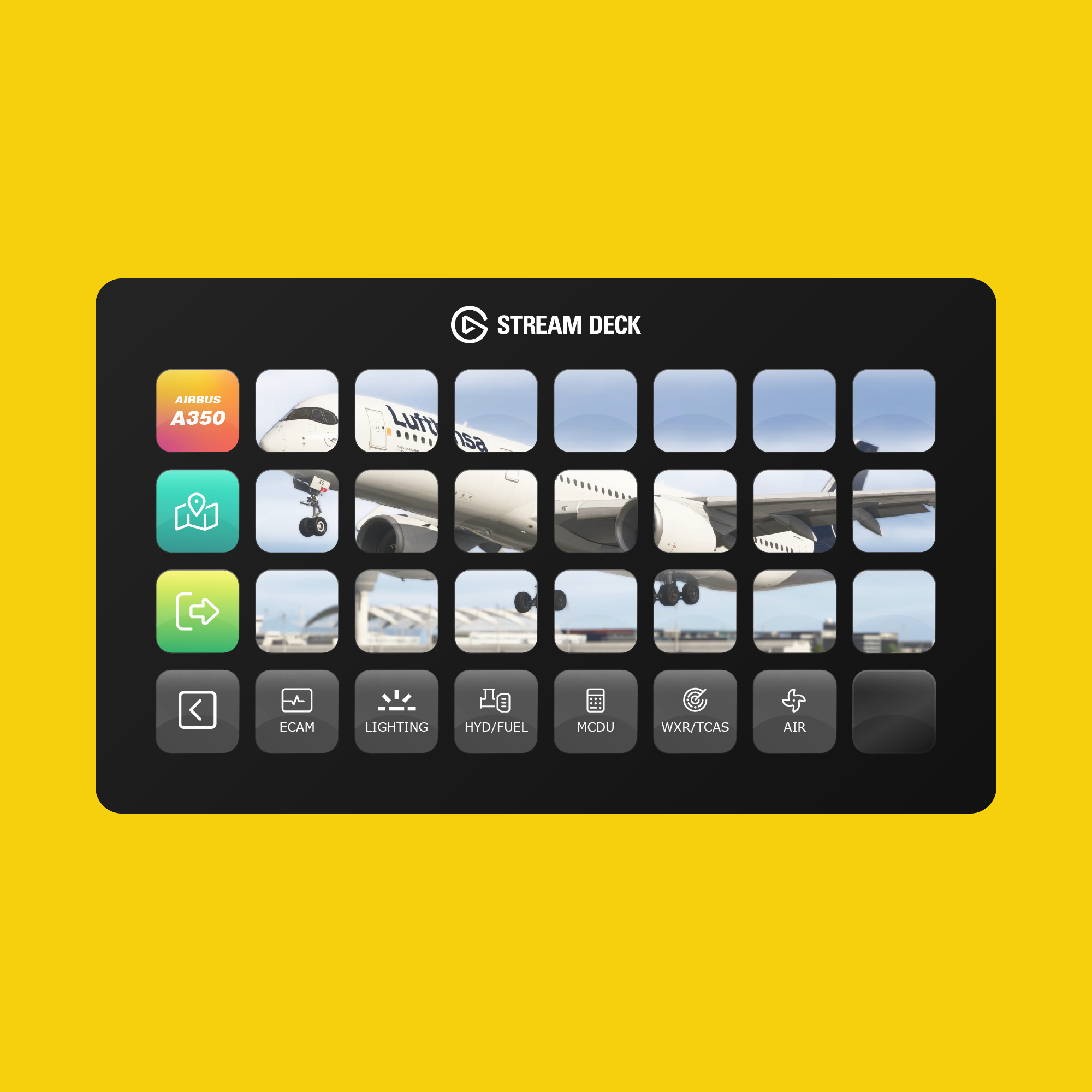 Experience the very best of Flight Panels with our iniBuilds Airbus A350 Stream Deck Profile for Microsoft Flight Simulator 2020 & 2024. With a staggering 29 pages and 700+ custom designed, pre-programmed and fully interactive buttons that match the look of the aircraft, you can control cockpit systems, buttons, dials and switches directly from your Stream Deck for the ultimate immersive experience.